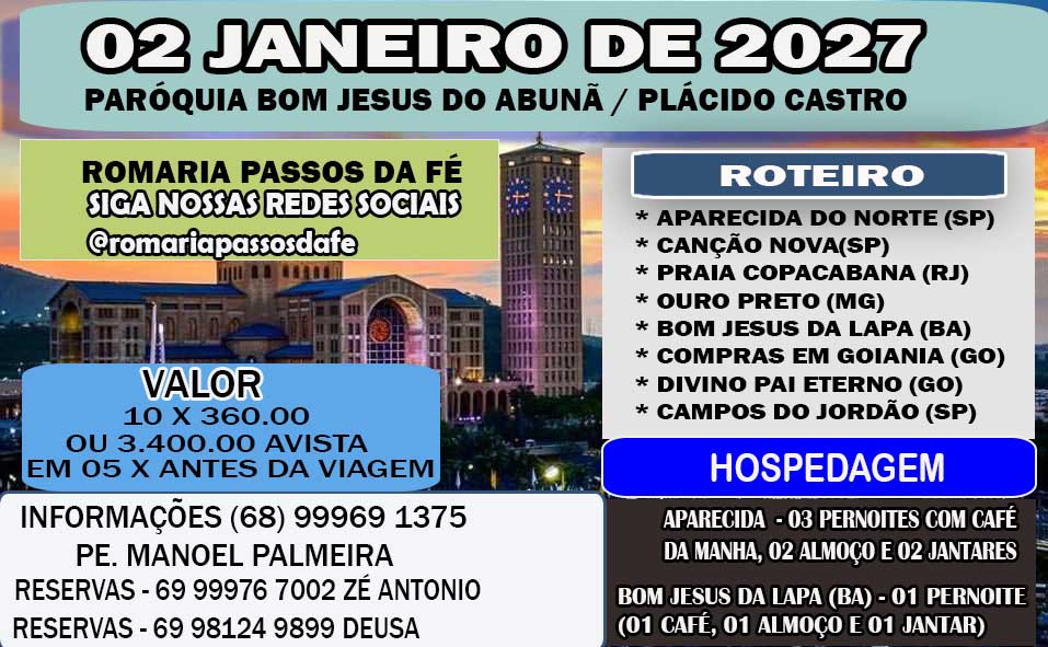 • RESERVAS ANTECIPADAS: Nossas Romarias podem ser dividido em ate dez pagamentos poren as poltronas sera mantida para nosso romeiro desde que mesmo assuma a resposabilidade de não haver desistência.